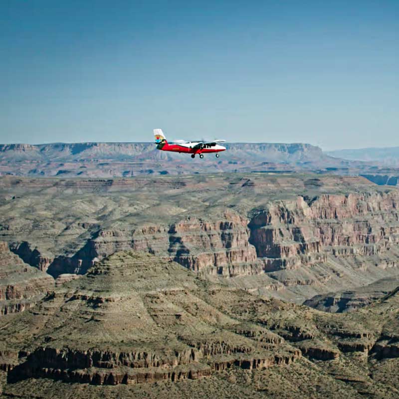旅程从大峡谷西部航空站开始,您将在航班起飞前一小时办理登机手续。登机后,您将从空中俯瞰峡谷的崎岖美景,令人叹为观止。高高的机翼专为最佳观光效果而设计,每个座位都能提供前排视野。.